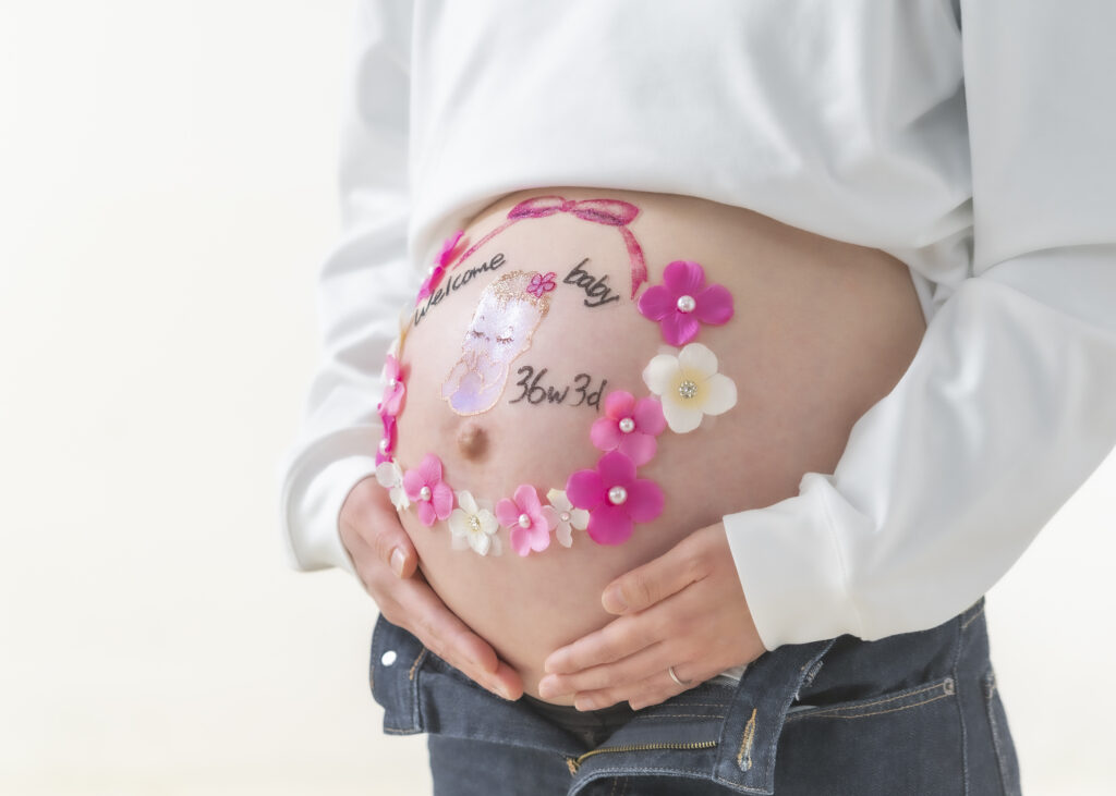 新しい家族がもうすぐ生まれまになるお客様のマタニティーフォトはボディージュエリーシールのベリーペイントで。