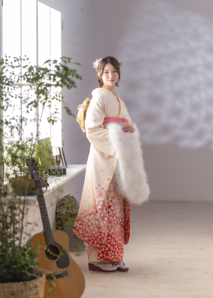 お振袖姿と、清楚で可憐な白いドレス姿での撮影。